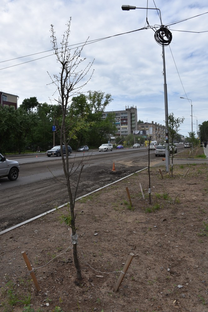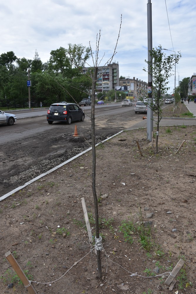 Поживают они отлично. Все, за исключением трёх саженцев. Один, что напротив Дома правосудия, засох и стоит, как мёртвая палка, без единого листика. Второму, рядом с ним, явно нехорошо: пациент, скорее, мёртв, чем жив. И третье исключение расположено у самой площади Металлургов. Молодое деревце кем-то безжалостно сломано (срублено?), от него остался лишь пенёк высотой примерно 20 сантиметров. Впрочем, обрубок не сдаётся и выкинул во все стороны тонкие веточки с густой зеленью.