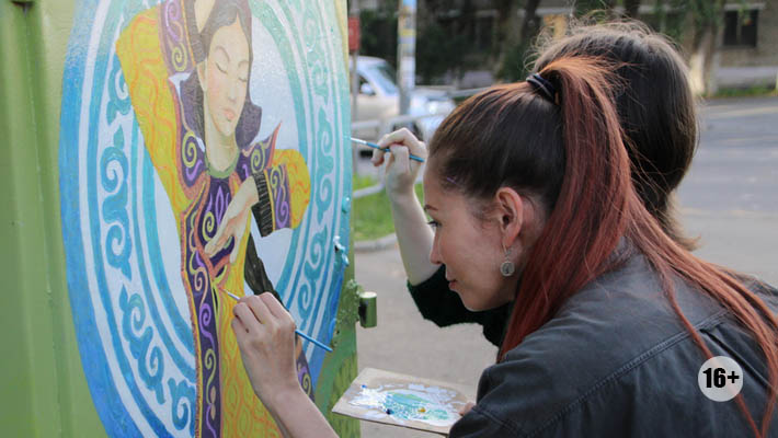 На проспекте Интернациональном, 49 стоит технологический шкаф. И сейчас местная художница Виктория Пассар занимается его украшением: рисует там нанайскую девушку в свадебном наряде.