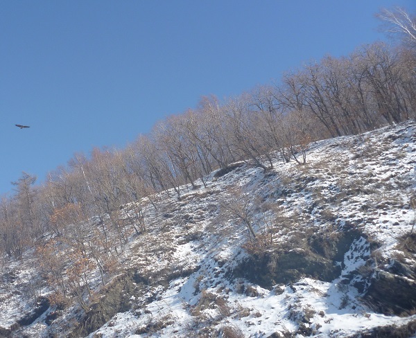 Птица схватила лакомый кусочек и полетела в сопку вместе с коллегой по полёту. Забавно…