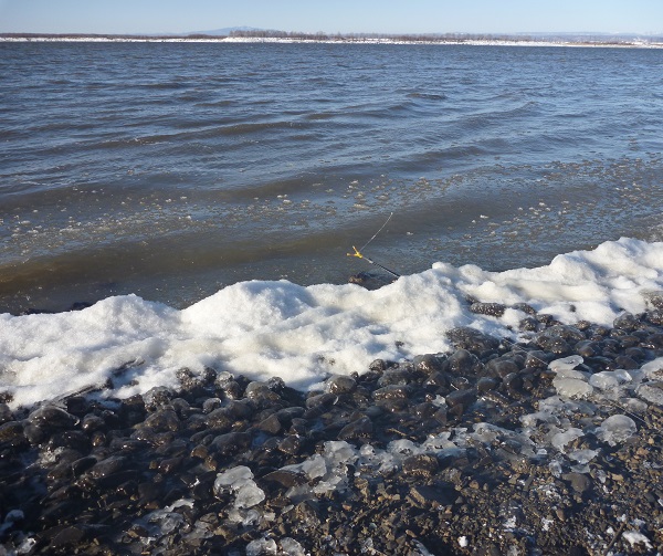 Мороз придавил хорошо, поэтому рыбная ловля происходила в сложных условиях. По урезу воды пошло снежное «сало», прибрежные камни оледенели и стали похожими на медуз. Леска снастей стала обмерзать, но у меня было давнее решение.