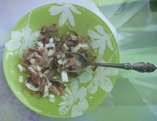 Тем временем на кухонном подносе подсохли уклеи и чебаки. Вяленая рыбка всегда в почёте у дальневосточников. Снимается шкура, и ароматный деликатес принимается в пищу. Но у меня есть рецепт, когда можно приготовить своеобразный салат. Назвал я его вялосол.