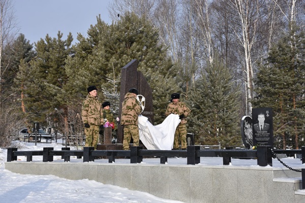 Когда с памятника сдёрнули покрывало, на нём обнаружилась эмблема Росгвардии и надпись: «Помним! Гордимся!». А под орденом Мужества, которым бойцы награждены посмертно, в граните высечены стихи: