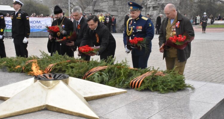 Глава города Александр Жорник в своём обращении напомнил о том, что в мраморе на Мемориале высечены имена более пяти тысяч горожан, не вернувшихся с фронта.
