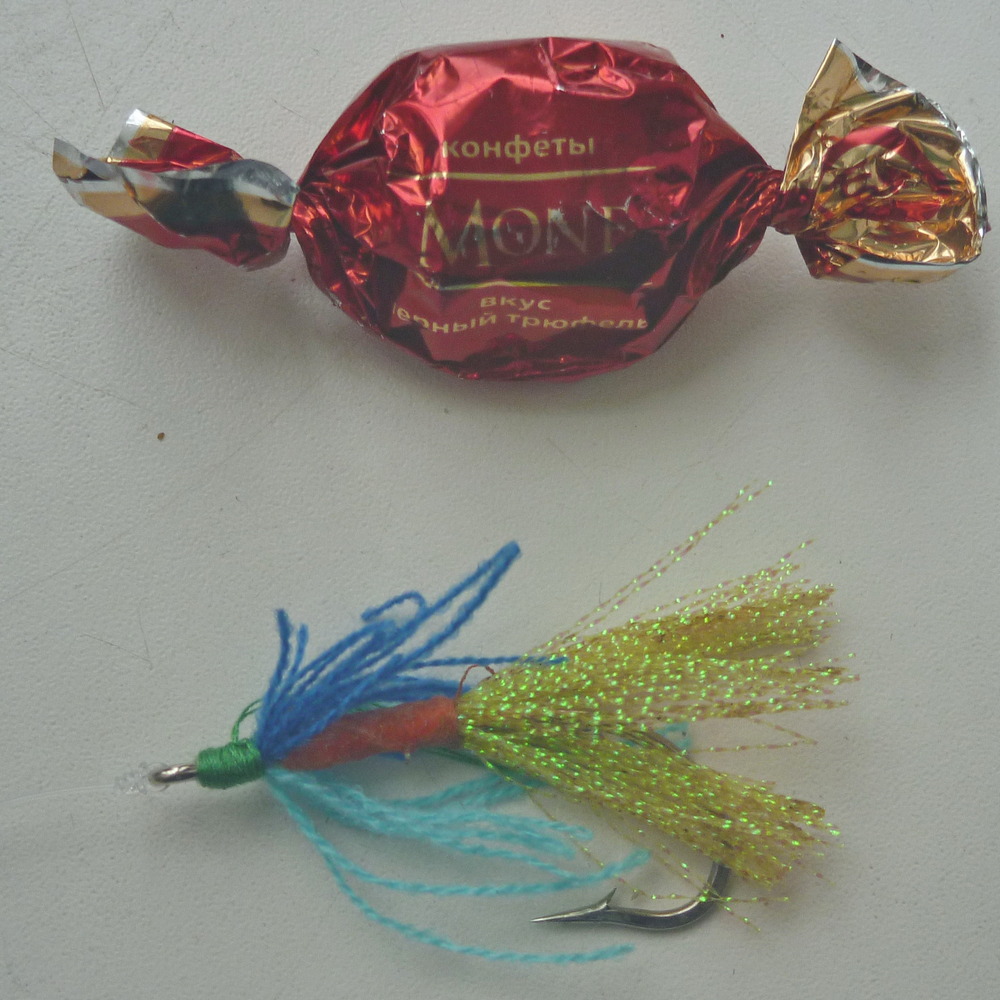 Как влияют мушки на клёв рыбы, знает каждый опытный рыболов. Вот я успешно ловлю до обеда различную рыбу, и наступает почти часовой перерыв. Ставлю вторым номером с глубины серебристую обманку с ярко-красным хвостом, связанную на тройнике. И надо же! Подряд попадаются пять рыб разных пород! Снова тишина. Добавляю на одну из мушек полоску мяса карася, и тут же её находит верхогляд!
