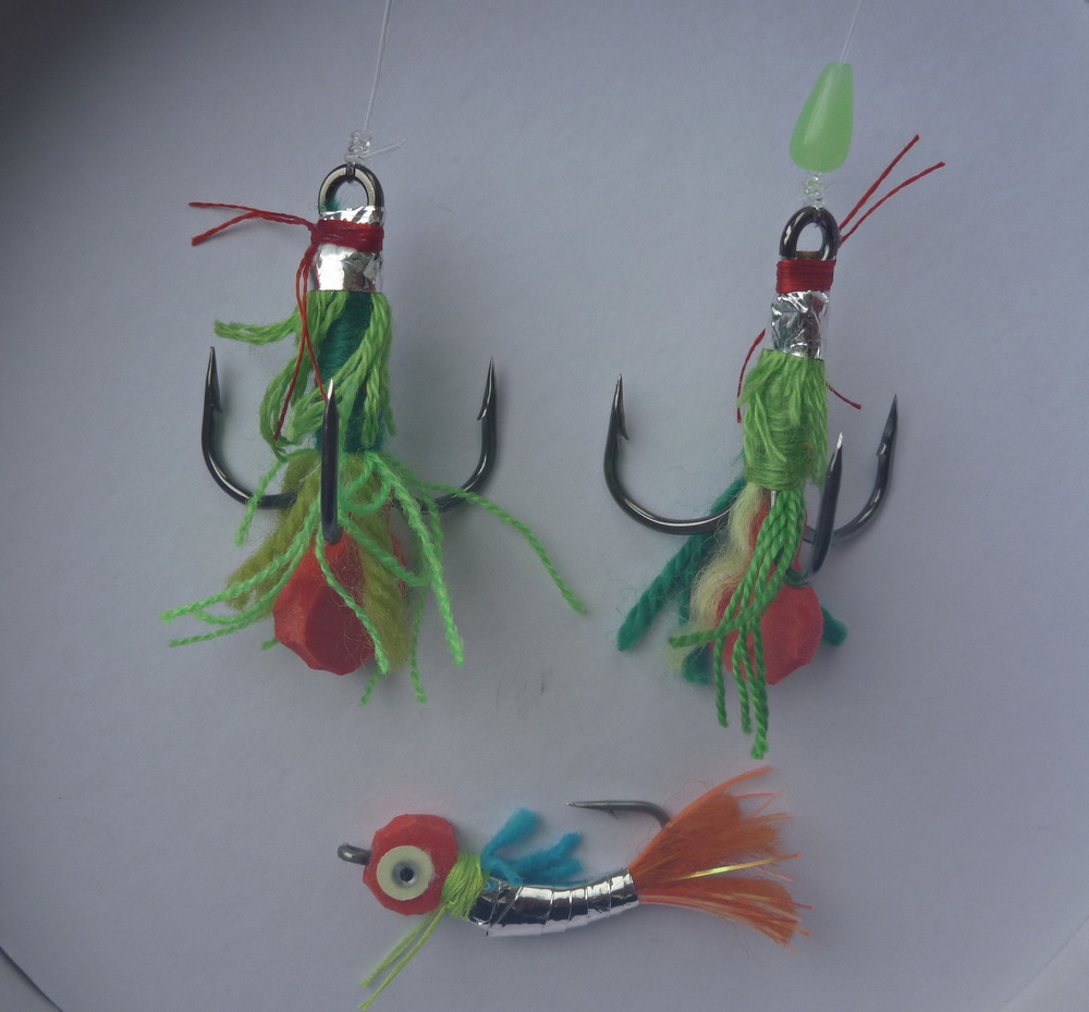 Мастер-класс. Мушки могут вязаться как на одинарном крючке, так и на двойнике или тройнике. Сначала из красной пенки вырезается плавучая заготовка. Это ножка с плоской круглой головкой, которая будет имитировать бойл. Ножка разрезается надвое до начала «бойла» и плотно приматывается ниткой к ножке крючка. Затем из двух-трёх различных зеленоватых шерстяных или других ниток вокруг крючка привязывается «махорик». После ножка обматывается утолщённой шерстяной ниткой (пряжей) другого оттенка. Возле колечка крючка она крепится красной шёлковой ниткой. Теперь к колечку добавляется небольшой «махорик» из шерстяных нитей другого оттенка и устанавливается небольшая подсветка из серебристой фольги кондитерской обёртки. Такую мушку можно подсветить фосфорной бусиной. Леска продевается через отверстие, и она граничит с колечком крючка.
