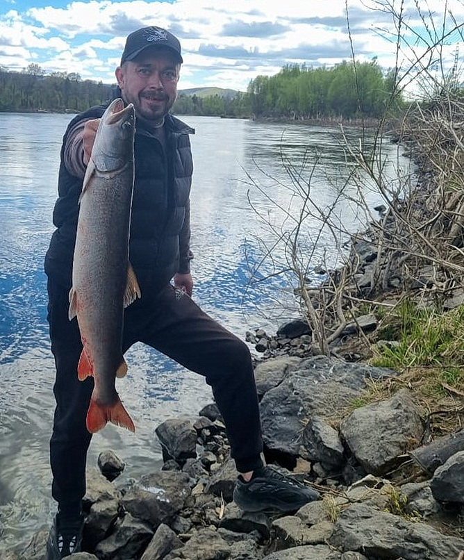 Некоторые рыболовы посещают горные реки. По моей консультации Илья Мордовин поставил подпуск на тайменя. Но вместо хариуса под берегом скакала лягушка. Смекалистый рыболов прикрепил её к снасти, и буквально через пять минут попался царь рыб таймень!