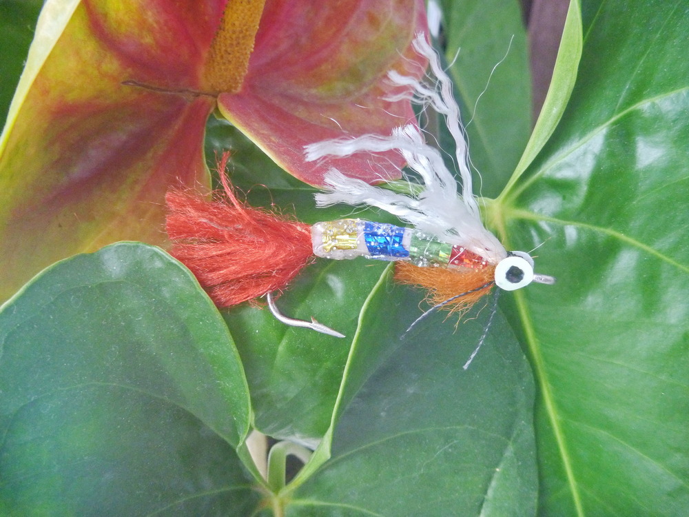 Мастер-класс. Сначала на крючок крепится плавающая пенка, затем вяжется ярко-красный хвостик и на туловище надевается трубочка ПВХ. Теперь на трубочку наклеиваются поперечные полосочки скотча, отражающего свет – золотистого, синего, зелёного и красного блеска. Далее с помощью клеевого пистолета и прозрачного стержня с серебристыми вкраплениями ламинируем туловище. Привязываем верхние «подкрылки» из белого капрона с люрексом и нижнюю оранжевую «бородку». Затем наклеиваем с обеих сторон глаза из салатного светонакопительного материала и ставим маркером зрачки. Такие мушки-приманки подойдут как для донного амортизатора, так и для нахлыста. Могут работать в тандемах «блесна-мушка» или «джиг-мушка» на самую различную рыбу.