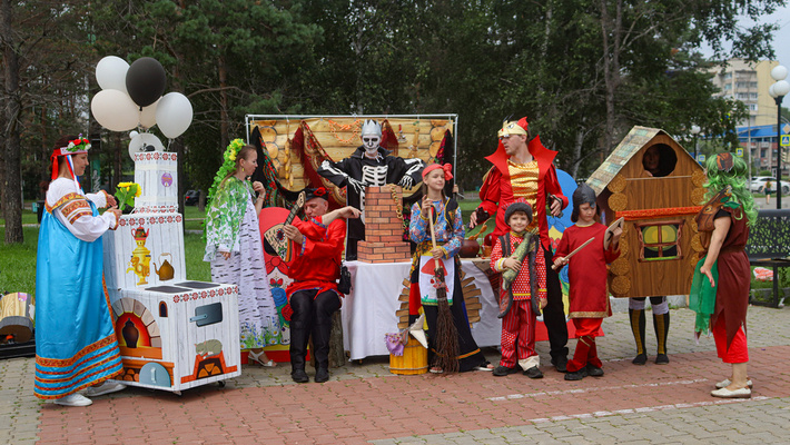 Вопреки названию «движ» был не только семейный – на него пришли также команды от местных учреждений культуры и образования. В толпе можно было разглядеть Кощея с Бабой Ягой и избушкой на (почему-то) человечьих ножках, ватагу персонажей из фильма «Алиса в стране чудес», эльфов, Незнайку, Емелю с Несмеяной и самоходной печкой, Царя морского со свитой, героев сказки про Буратино…