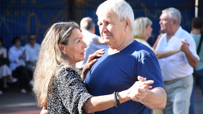 Частью программы ретровечера стал мастер-класс, который провёл танцевальный коллектив ветеранов «Давайте потанцуем». Кто-то участвовать не пожелал и, заскучав, предпочёл покинуть площадку на время обучения, чтобы прогуляться по парку. Но человек 50 решились попробовать свои силы и остались очень довольны: