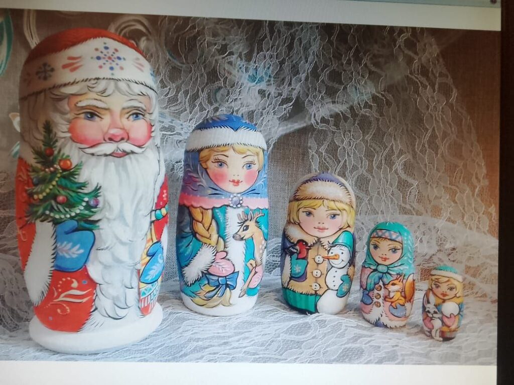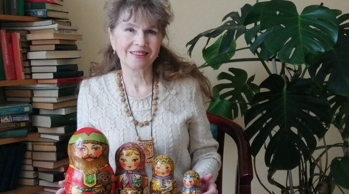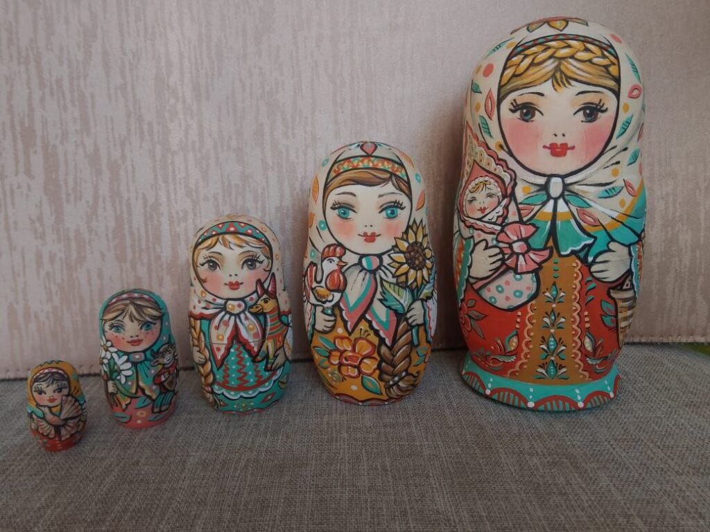 Я работала преподавателем изобразительного искусства в школе №23, но, поскольку в школе был уклон на изучение предметов художественно-эстетического направления, там была и живопись, и декоративно-прикладное искусство, к которому меня всегда тянуло, в частности, к росписи русской матрёшки. Мне нравилась эта тема. Одно время покупала готовые матрёшки, но в какой-то момент подумала, я ведь и сама могу расписать! Лет 5-6 назад начала расписывать коллекцию из трёх матрёшек. Как раз была осень, и я подумала, почему бы не сделать коллекцию в красках этого времени года? Потом мне захотелось сделать зимнюю, весеннюю, летнюю коллекции. Зимняя похожа на новогодние игрушки: матрёшки в шубках, полушубках, обязательно держат в руках снеговичков, веточки ели. Летняя, наоборот, очень яркая, с венками из полевых цветов. Впоследствии я их объединила в коллекцию «Времена года». Четыре времени года по три матрёшки, итого 12 штук.