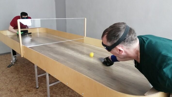 Стоит сказать, что в прошлом году городское Общество слепых приобрело специальный теннисный стол с закруглёнными углами, с центральной пластиковой стеной, которая разделяет поля и защищает от случайного удара шарика навесом.