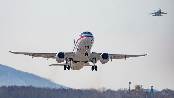 Опытный образец самолёта «Суперджет» совершил первый полёт с отечественными двигателями ПД-8 в небе над Комсомольском.