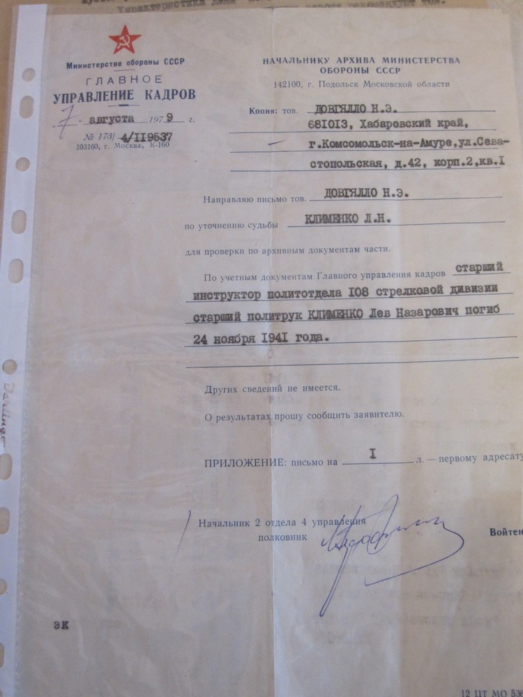 Спустя много лет родным удалось выяснить, когда погиб их отец. В короткой официально-сухой справке Министерства обороны написано: «Старший инструктор политотдела 108-й стрелковой дивизии старший политрук Клименко Лев Назарович погиб 24 ноября 1941 года».
