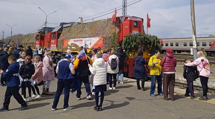 Прибытие поезда на вокзал Комсомольска ожидалось в 11:00, а с 10:30 – праздничная программа. Всё было обычно для патриотических мероприятий: много волонтёров, полевая кухня с солдатской кашей, разложенное на столах стрелковое вооружение со сборкой и разборкой автоматов Калашникова, звучат песни военных лет вперемешку с современными хитами. Музыка, кстати, живая: выступает штатный военный оркестр Комсомольского гарнизона.