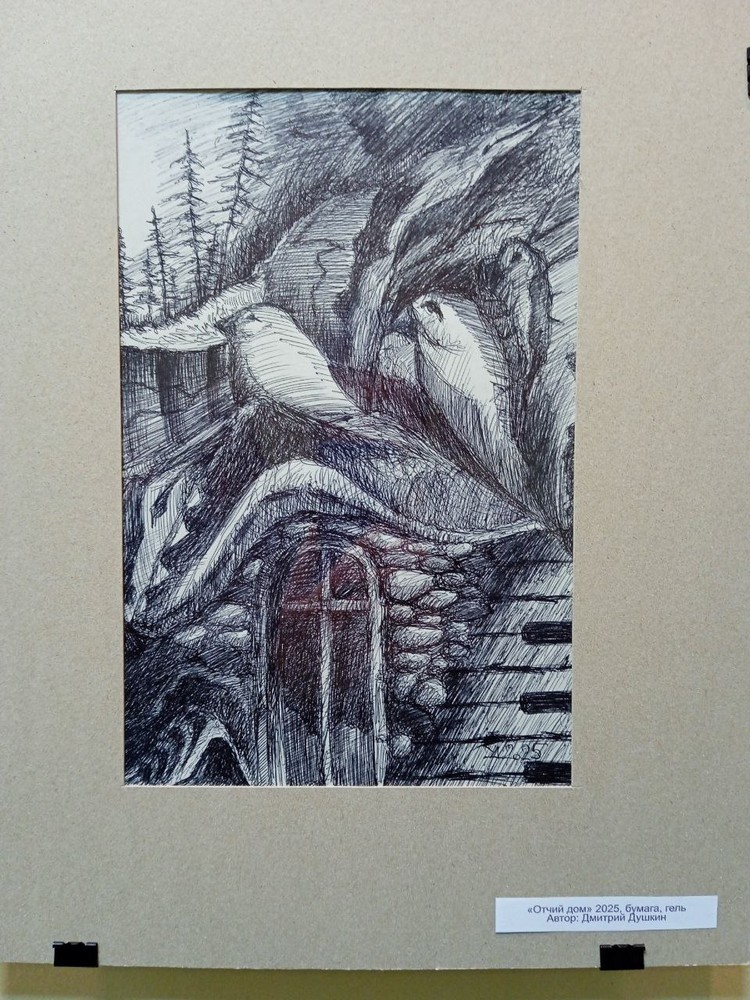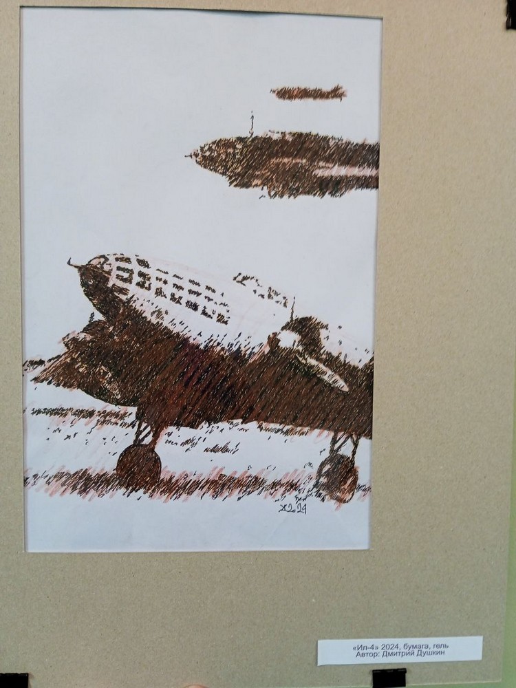 В экспозицию вошли 23 графических рисунка, выполненных чёрной гелевой ручкой и сангиной*. Все они – о Великой Отечественной войне, а сама выставка приурочена к 80-летию Победы.