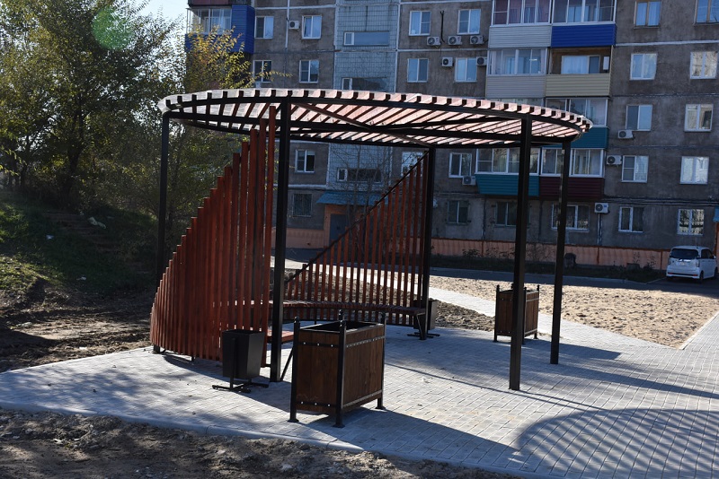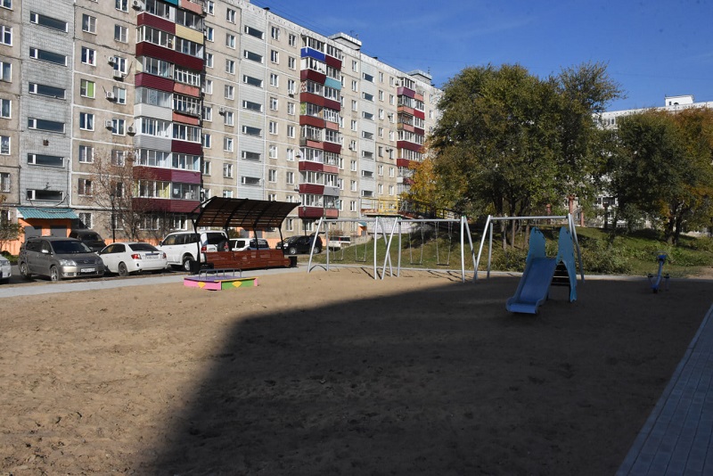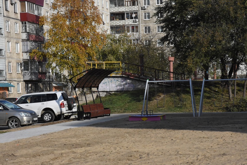 В Комсомольске сдали ещё один двор, отремонтированный по единой президентской субсидии. Точнее, это группа дворов между панельными девятиэтажками по улице Вокзальной, 80 и 80/2, и Дикопольцева, 32.