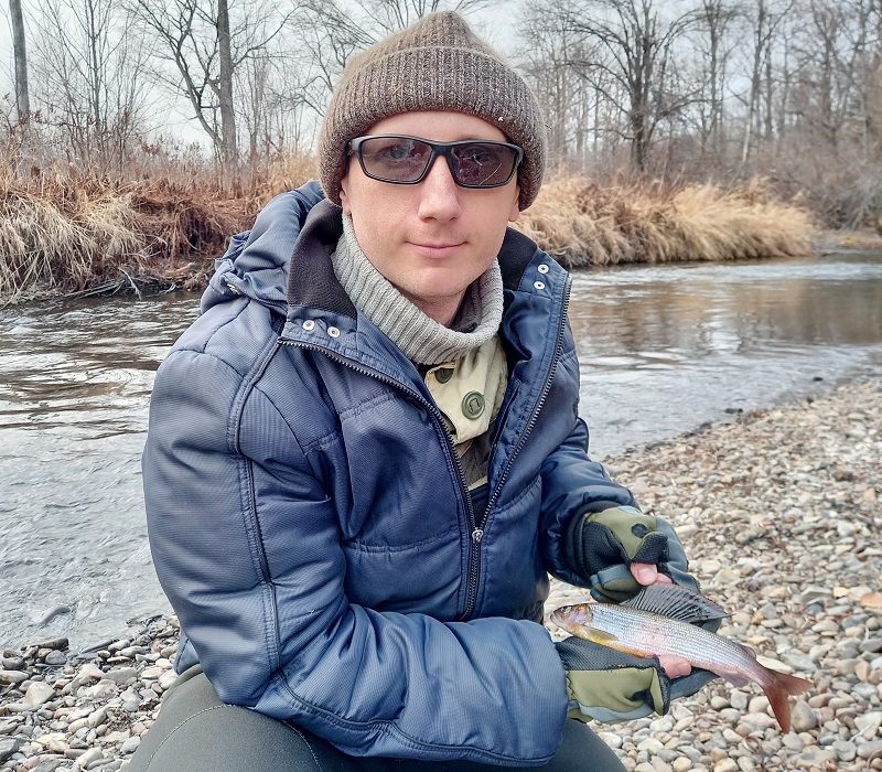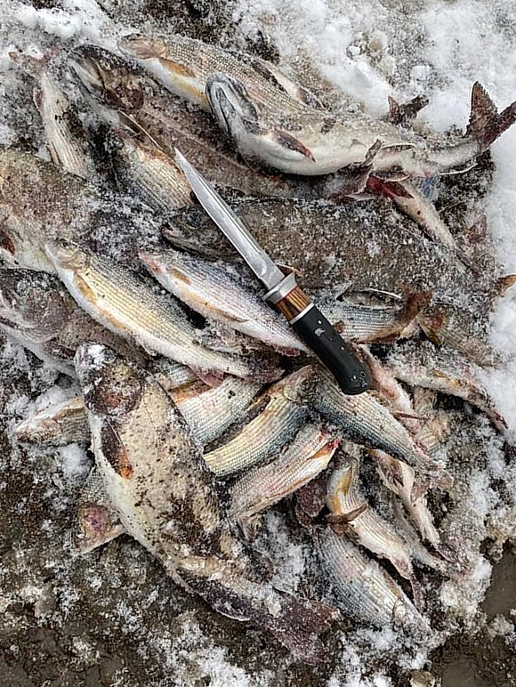 Новичок Валерий вылавливает первого красавца-хариуса. Как он смотрится на белом фоне!