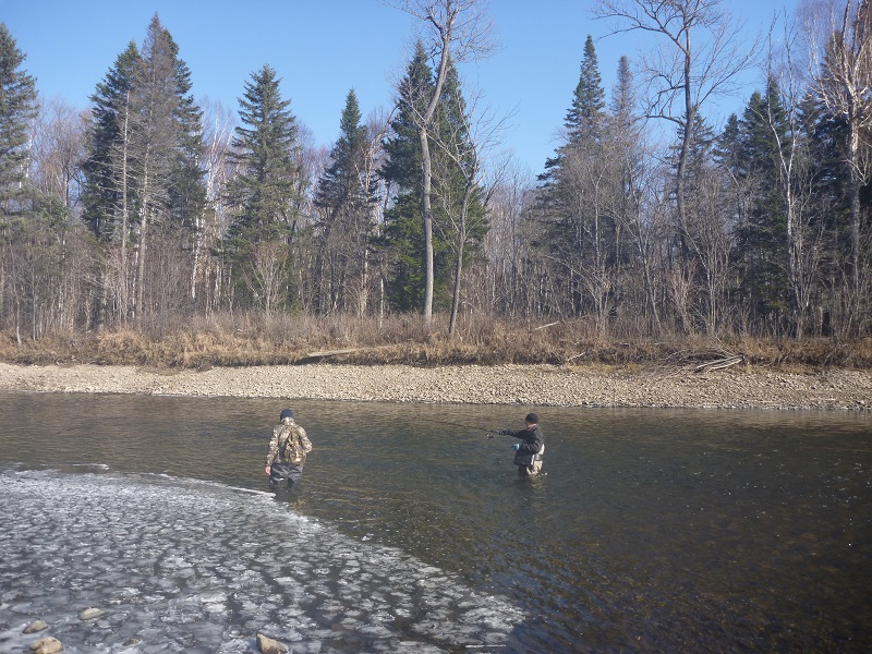 17 октября мои товарищи энергостроители из города Челябинска пожелали повторить выезд на дальнюю горную реку. В августе прошло первое знакомство с нашей дальневосточной рекой, и она приятно легла на их рыболовные сердца. Река встретила нас чистой водой и низким уровнем. Я даже переходил её большие протоки в болотных сапогах. Недавно мои друзья дважды добивались здесь отличных уловов. Погода прекрасная! Солнечная и тихая. Местами сохранился первый снег, листва в основном опала, и наши приманки отчётливо виделись в толще воды. Увядающий октябрь – это переходный период из осени в зиму. А это зачастую грустноватая картина. Но, как говорится, в каждом сезоне года – свои прелести!