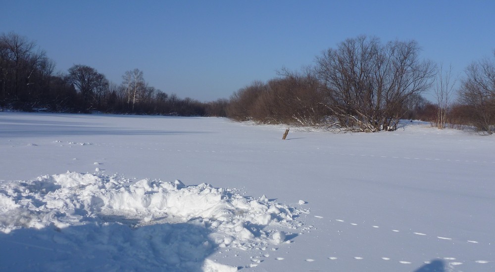 Среди снегов рыжеет разнотравье. Нарисовалась новая красивая картина дальневосточной природы. А вот и река! Три дня назад Амур-батюшка сопротивлялся и тянул свои ледовые плоты к океану. Но вот силы его иссякли, и хрустальная смирительная рубашка до апреля плотно его укрыла.