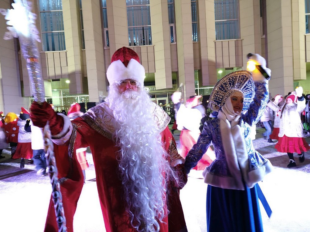 Зимний городок открылся на Театральной площади. Дед Мороз со Снегурочкой при поддержке сказочных персонажей поздравили комсомольчан и зажгли огни на ёлке.