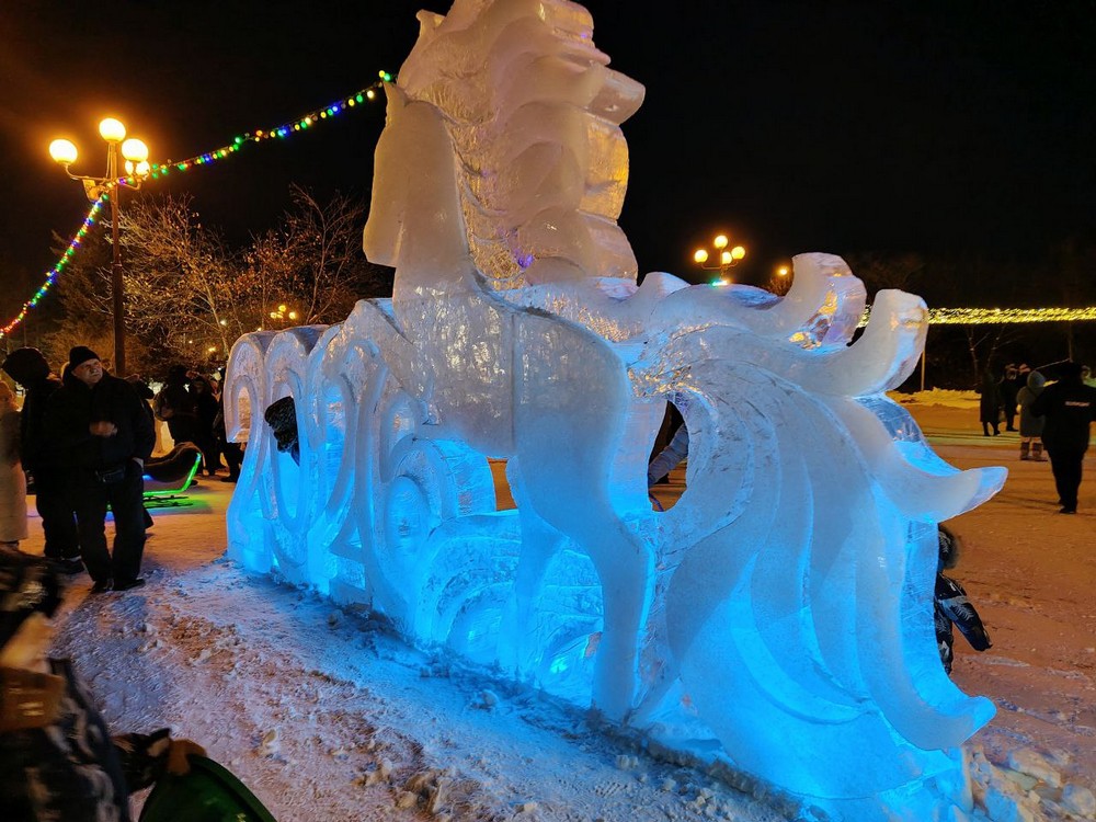 Традиционно на площади появились ледовые скульптуры и две горки, украшенные вырезанными во льду картинками. Над всеми изображениями работали местные сертифицированные мастера.