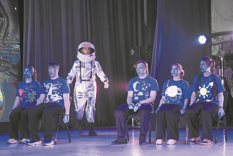 Завершился конкурс космическим дефиле. Участники вышли на сцену в придуманных ими образах, соответствующих тематике мероприятия.