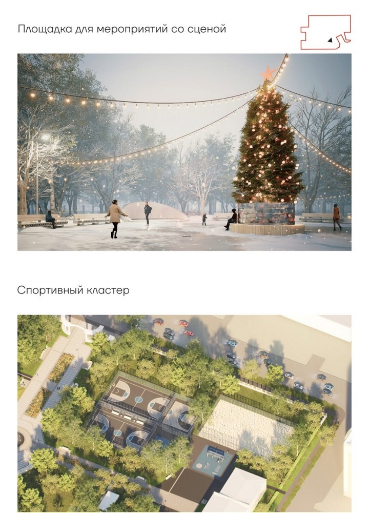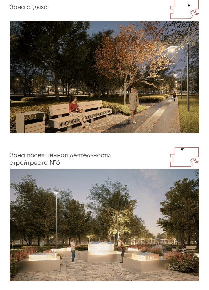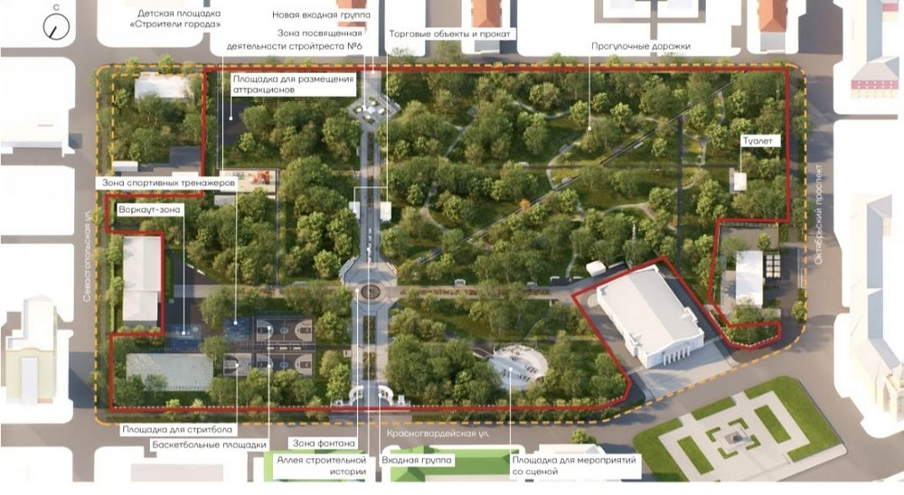 Парк, созданный в 1939 году, сохранит неоклассический стиль советского периода. Будут сохранены и восстановлены существующие объекты, в том числе и фонтан. При этом в нём будут созданы новые функциональные зоны: Аллея Строительной истории, спортивная зона, детская площадка, территория аттракционов, территория, посвящённая деятельности стройтреста №6, территория торговых объектов и проката, площадка для мероприятий со сценой, зона фонтана, прогулочные дорожки, входная зона, туалет. Работы предстоит очень много. Они должны завершиться до конца этого года».
