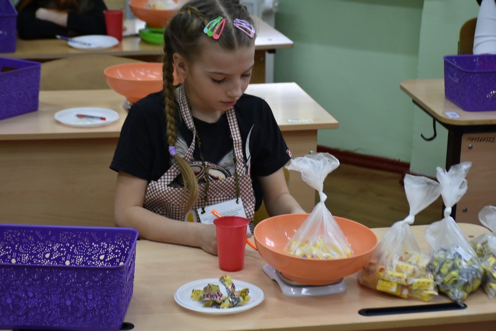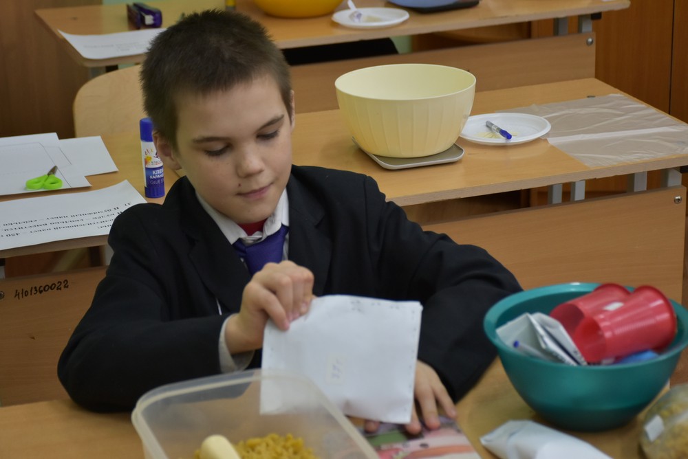 Младшие ребята сначала раскладывали три вида конфет по пакетам и затем взвешивали их. Более старшие дети фасовали гречку в пакеты согласно указанным объёмам. Третьи распределяли макароны и упаковывали их. Это самое сложное из заданий, так как продукт нужно было не только верно расфасовать, но и сделать под них пакеты или кульки.