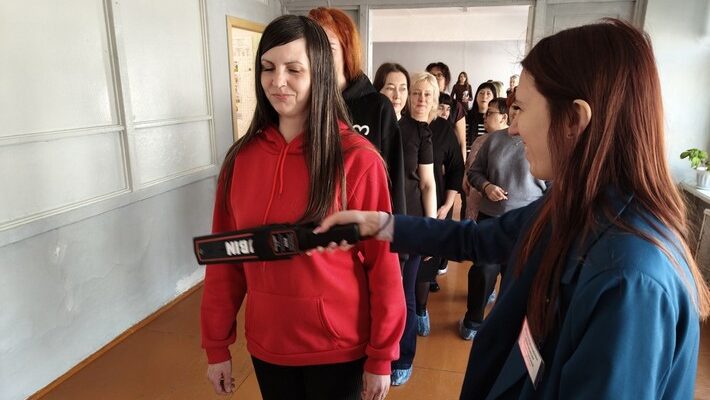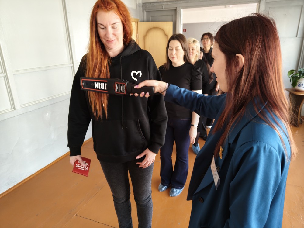 В каждой школе у родителей, как и полагается, проверяли документы, затем участники акции узнавали своё место в аудитории. Все прошли через рамку металлоискателя и сдали на время испытания свои личные вещи, включая мобильные телефоны.